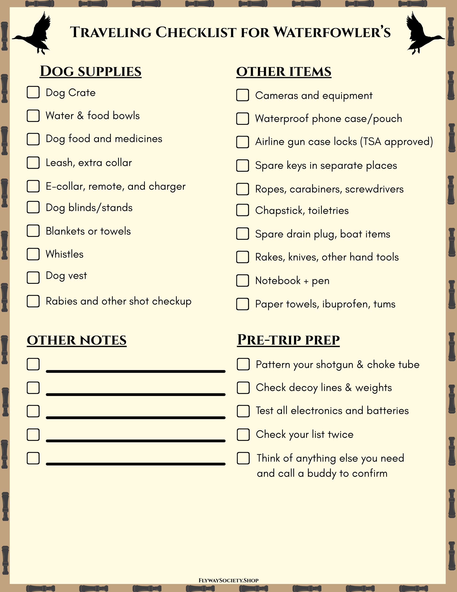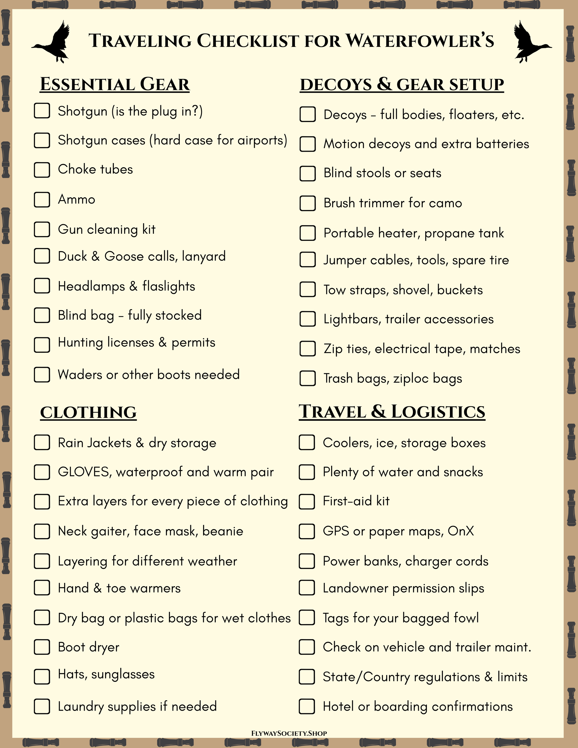 Traveling for a waterfowl hunt? Don’t travel 12 hours from home and risk forgetting the gear that can make or break your trip. The Ultimate Traveling Waterfowl Checklist is a professionally designed, hunter-tested, and fully comprehensive 3-page PDF built to keep you organized and fully prepared.