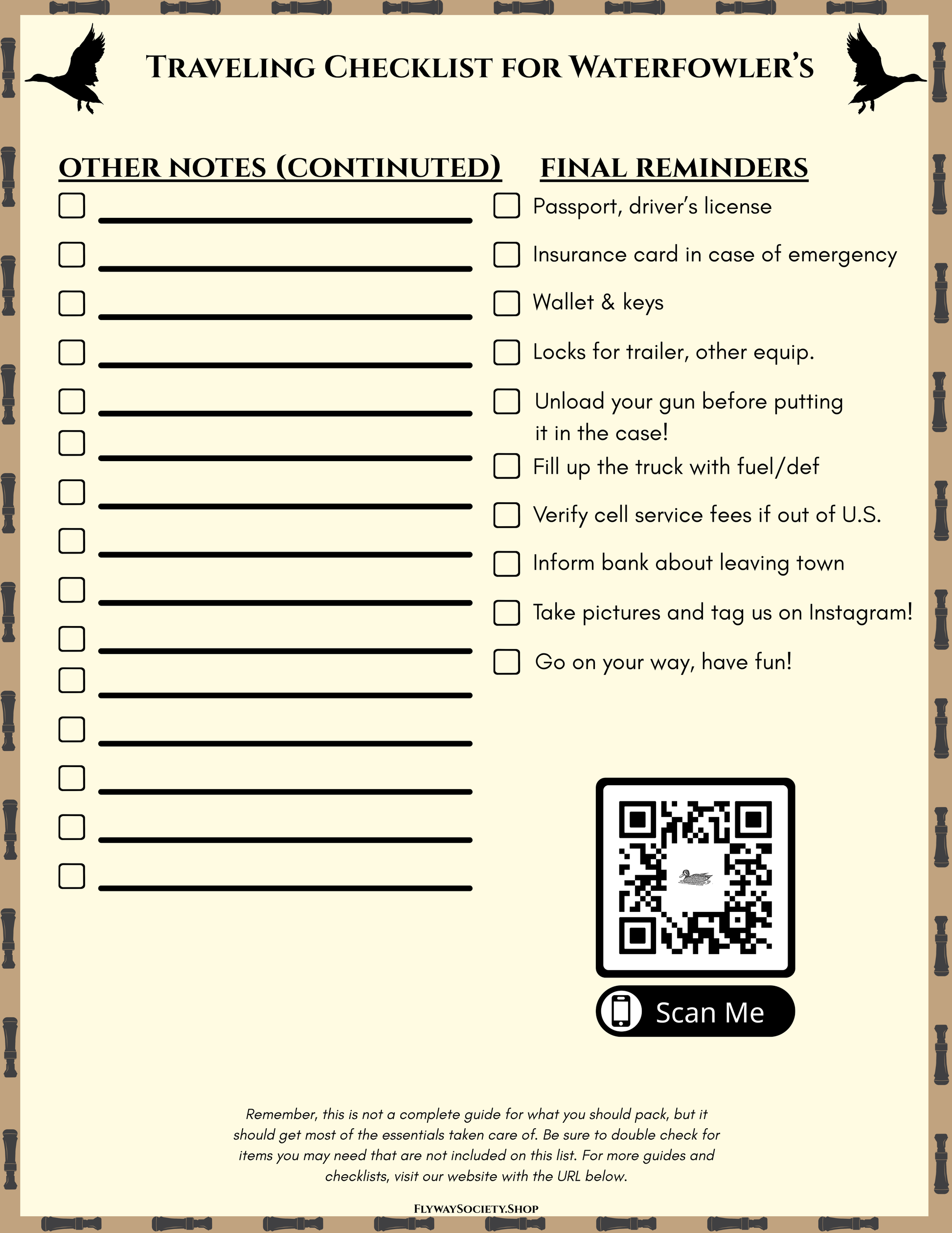 This checklist covers everything modern hunters need, including must-bring gear, overlooked items, travel logistics, dog supplies, and pre-trip preparation. It even includes blank note sections and a built-in QR code to provide instant access to more Flyway Society guides, resources, and updates.